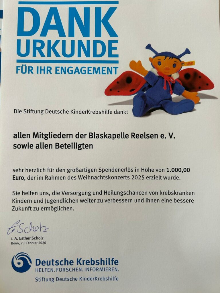 Wir, die Blaskapelle Reelsen, sind überwältigt! Ein riesiges Dankeschön an alle Spenderinnen und Spender sowie alle Gäste unseres Weihnachtskonzerts 2025. Durch eure Spende bei unserem Weihnachtskonzert, konnten wir eine beachtliche Summe an die Kinderkrebshilfe übergeben.