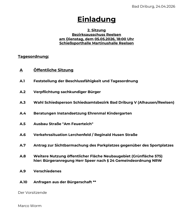 | A.3 | Wahl Schiedsperson Schiedsamtsbezirk Bad Driburg V (Alhausen/Reelsen) | ||