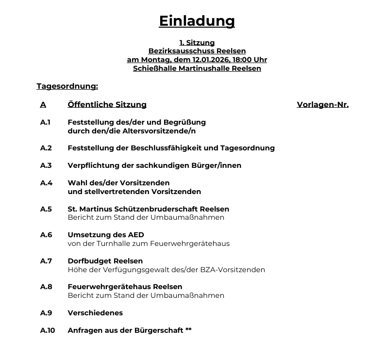 Bezirksausschuss Reelsen am Montag, dem 12.01.2026, 18:00 Uhr Schießhalle Martinushalle Reelsen