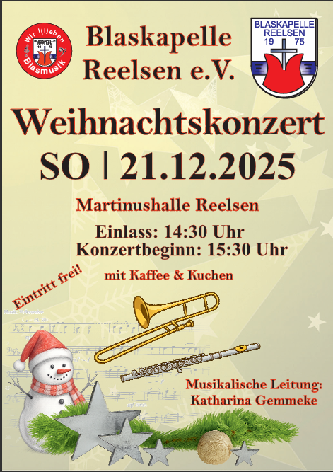 Merkt euch den Termin vor: Am Sonntag, den 21. Dezember 2025, laden wir, die Blaskapelle Reelsen e.V., euch wieder herzlich zu unserem jährlichen Weihnachtskonzert in die Sankt Martinushalle ein!